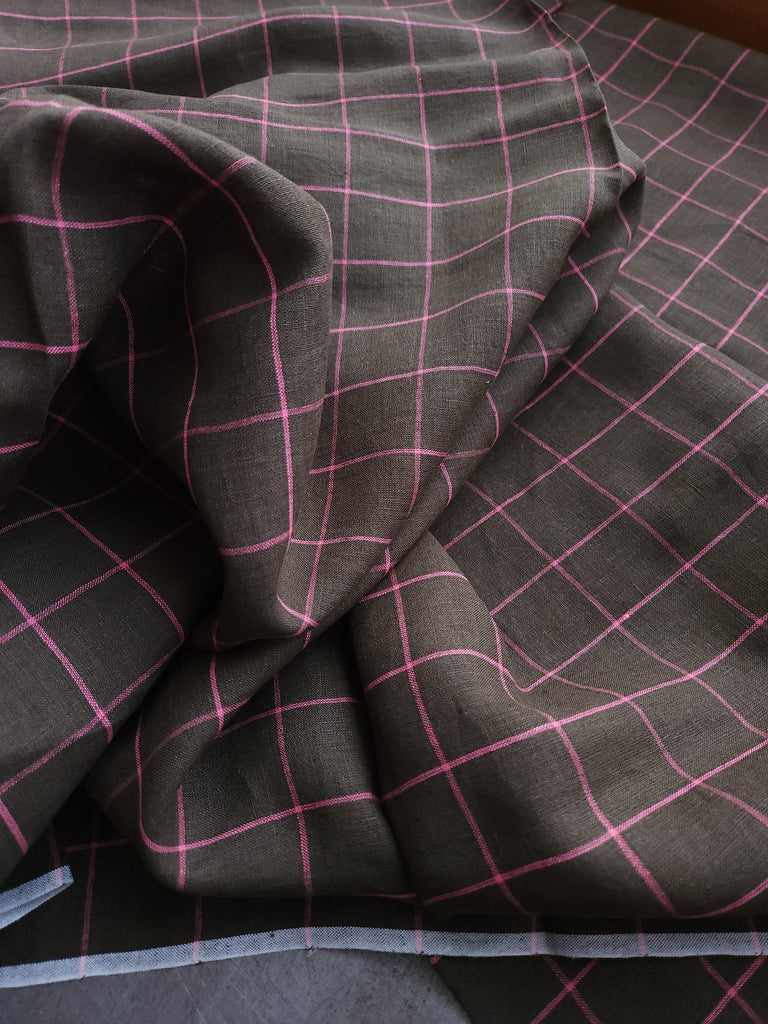 A mossy green brown handloom linen with a vivid pink check. Check size: 3.5cm