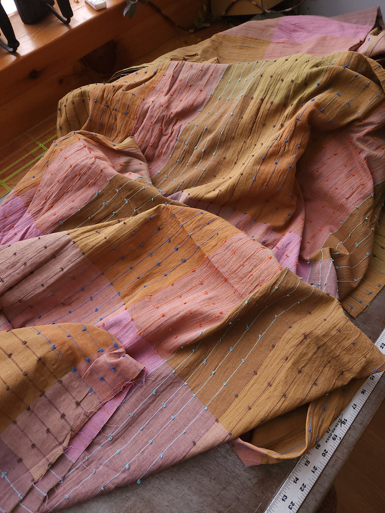 A slubby Indian checked cotton with woven colourful loops. In dusty pink, lilac orange and yellow tones with blue, brown and orange loops. This is a loom state cotton so will soften once washed.