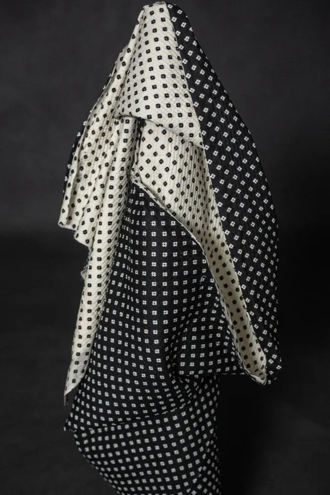 One side of the cloth is black with white flowers and the other side is white with black flowers.