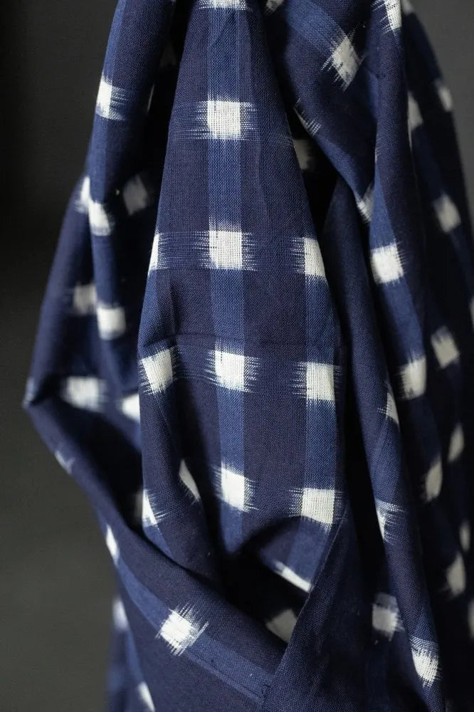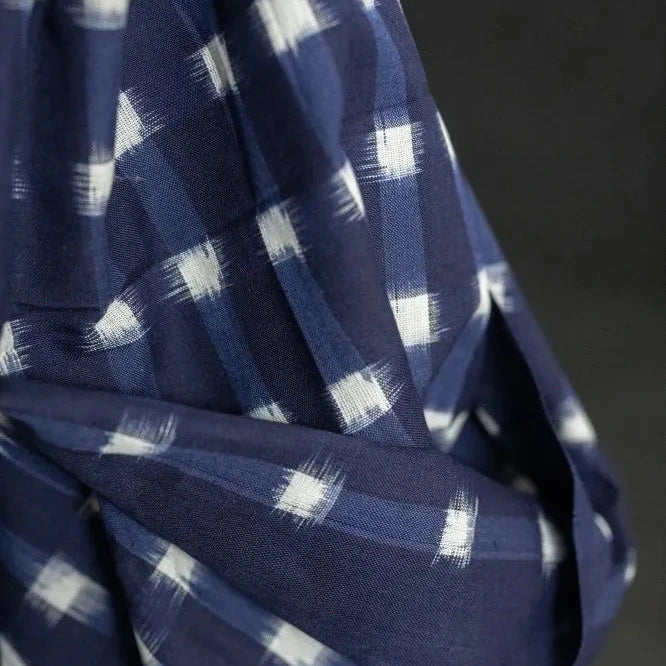 Ikat is a resist dyeing technique where the threads used for weaving are dyed beforehand. The Ikat threads are bound in a pattern so that the threads covered by the binding ‘resist’ the dye, creating a design. Ikat cloths are prone to slubs and often have ties in the cloth where one weaver ends and another begins, the ties will be on the wrong side of the cloth. These are not flaws. The cloth is hand-woven so the pattern is irregular in places, this also is not a flaw. Suitable for dresses, tops, shirts, and looser fitting trousers or shorts.