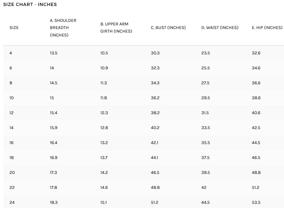 Sizes: 4-16 or 18-30 (see sizing charts)