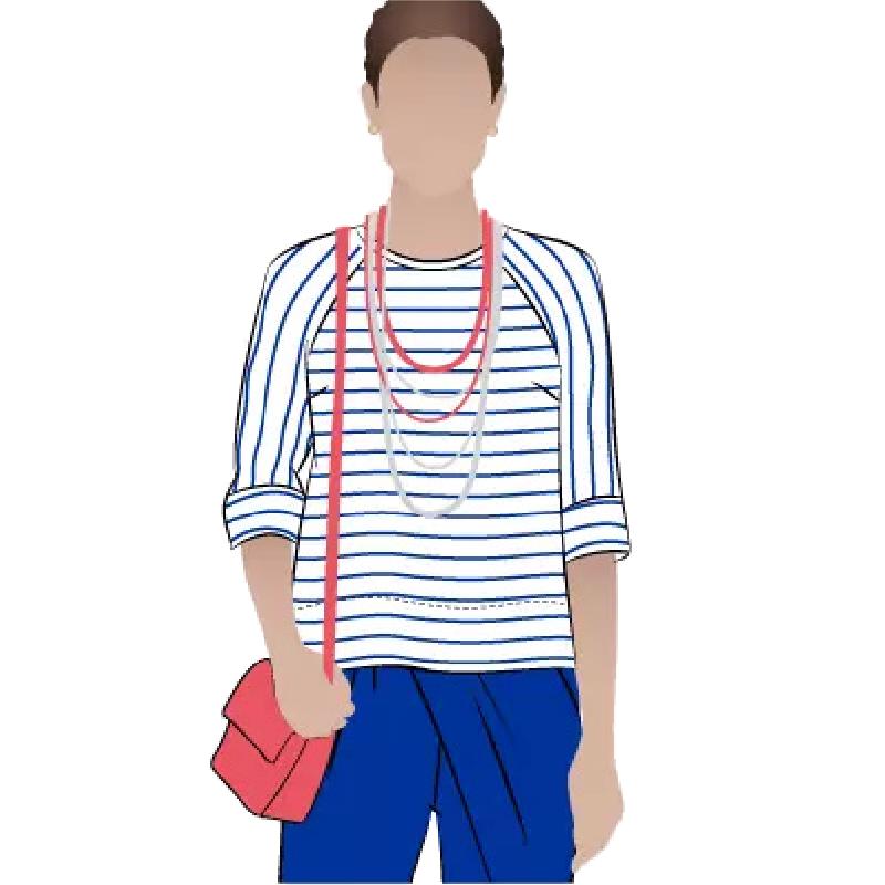 A great everyday raglan sleeved top with a slight trapeze body. The wide hem allows this top to fall beautifully. Make this in a stripe to show off the design lines. This top can be made in a knit or a stretch woven fabric.